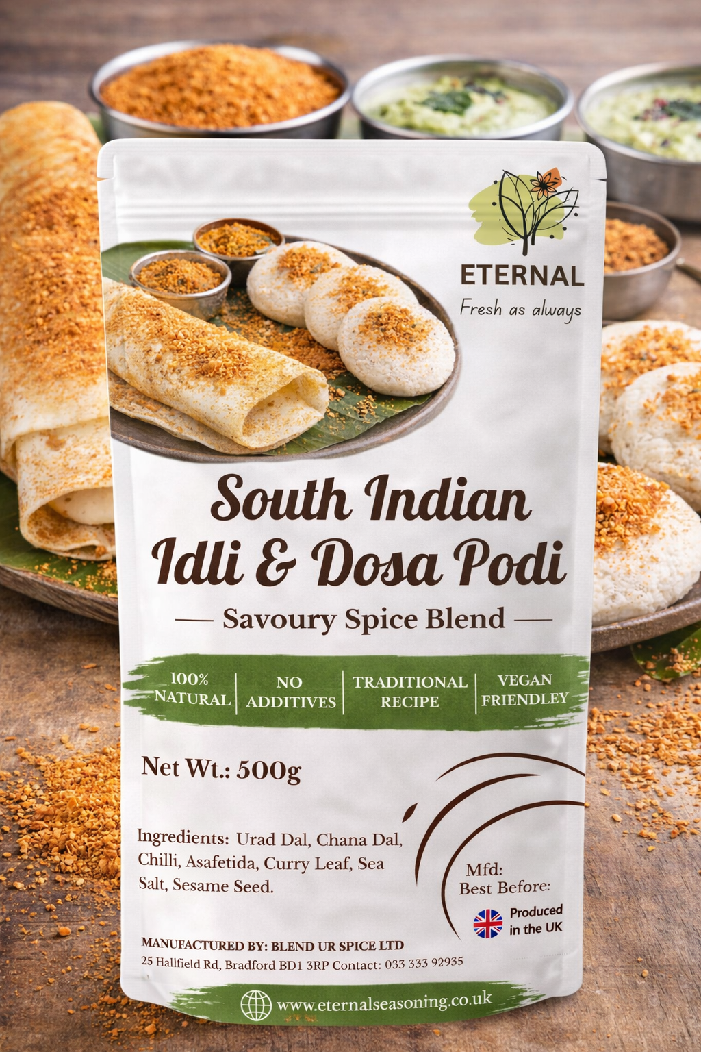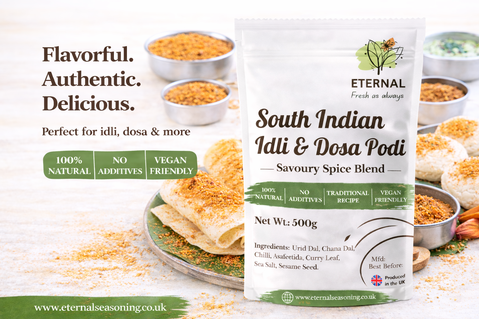 Bring authentic South Indian flavour to your meals with Eternal Idli & Dosa Podi. Made from roasted lentils, chillies, and sesame seeds, this traditional chutney powder delivers a rich, nutty, and mildly spicy taste.